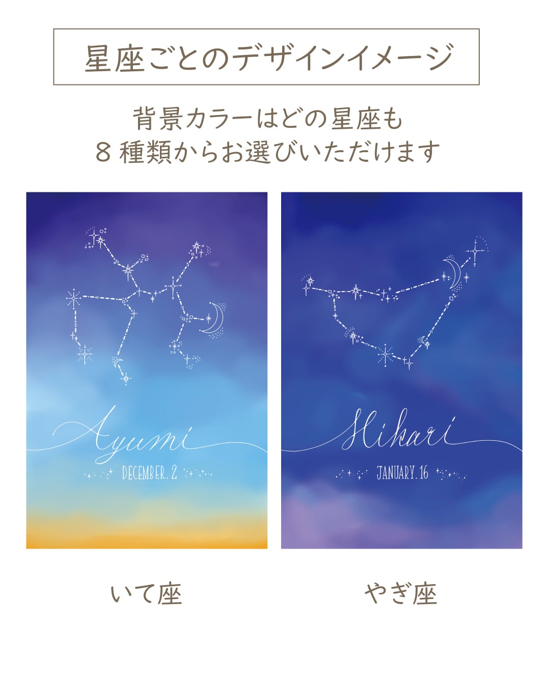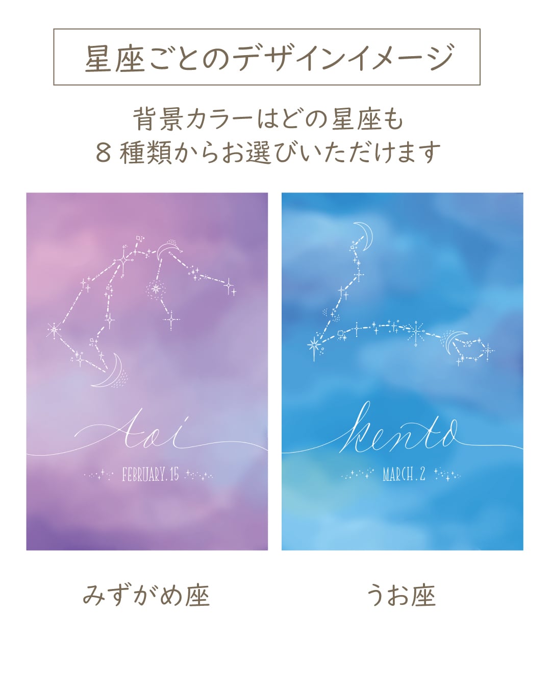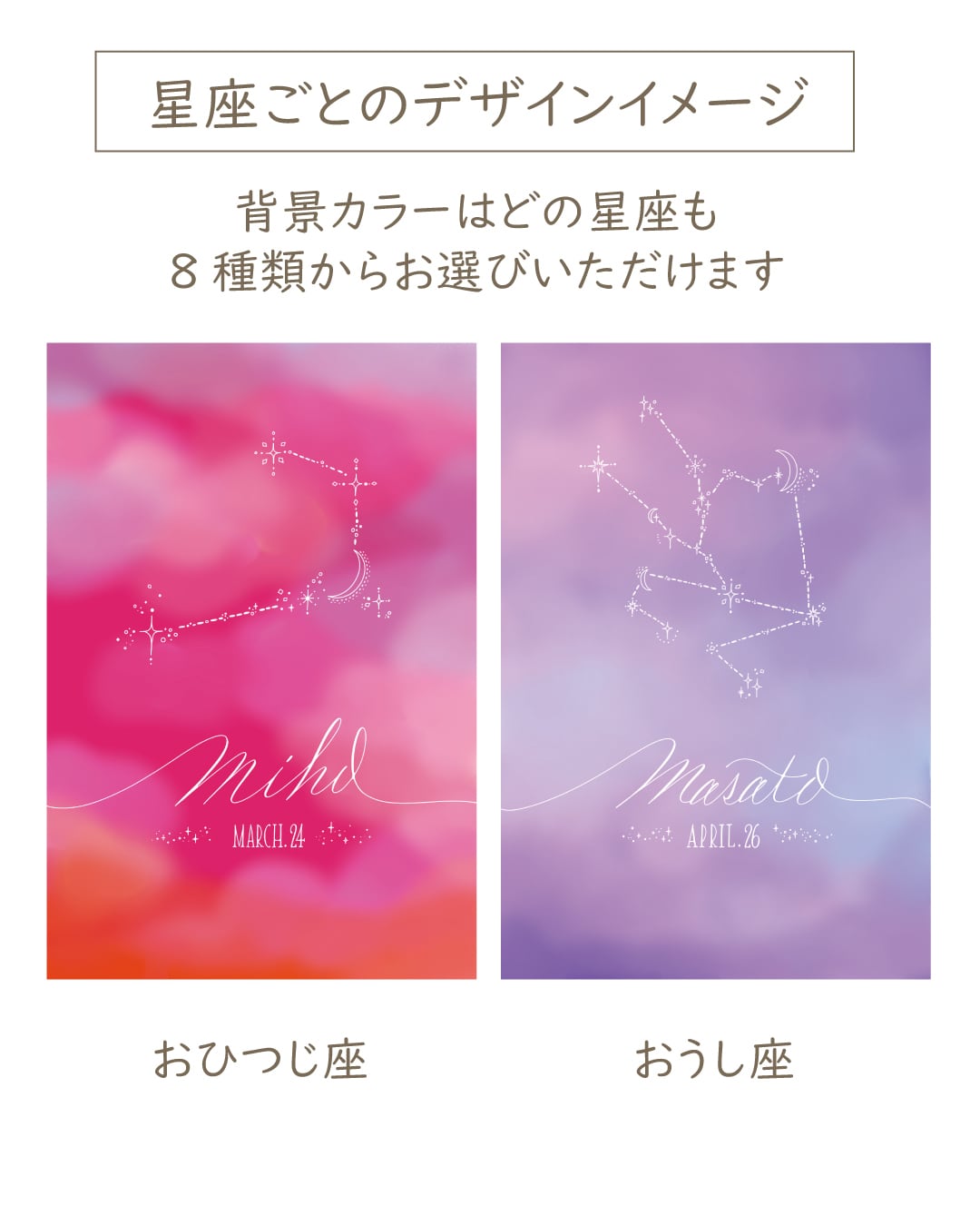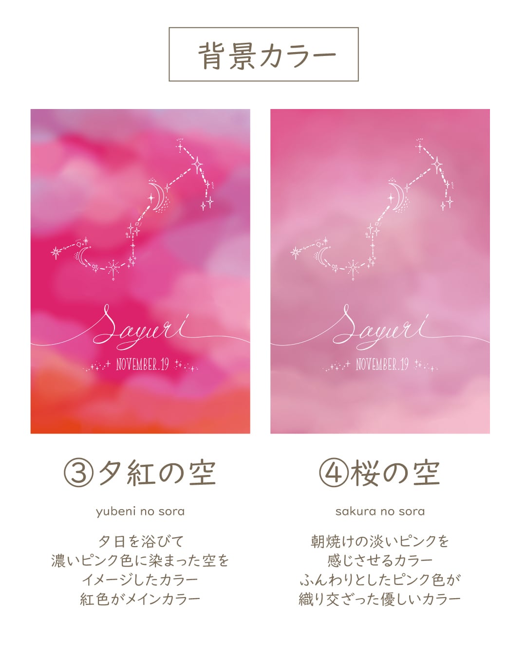 うつりかわる様々な空の景色をイメージした背景に白いラインで星座とお名前をお描きします。