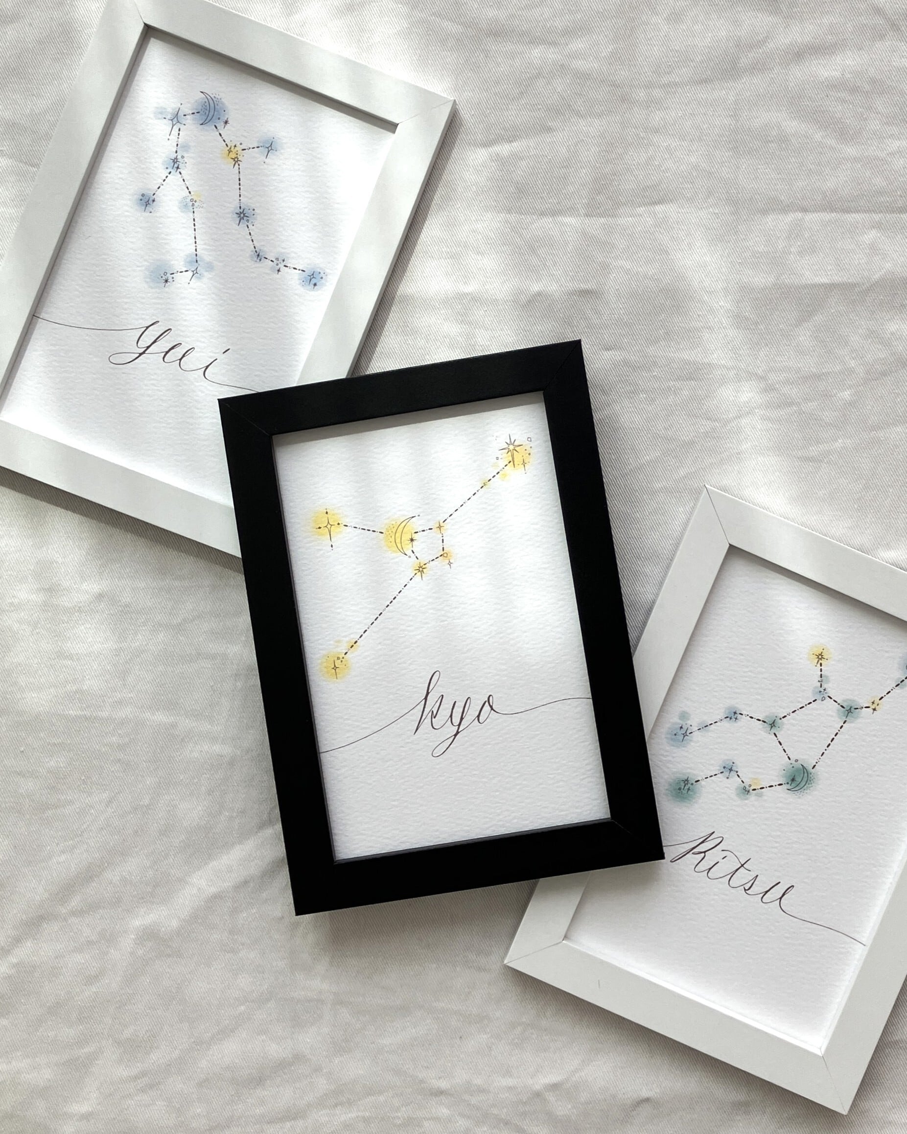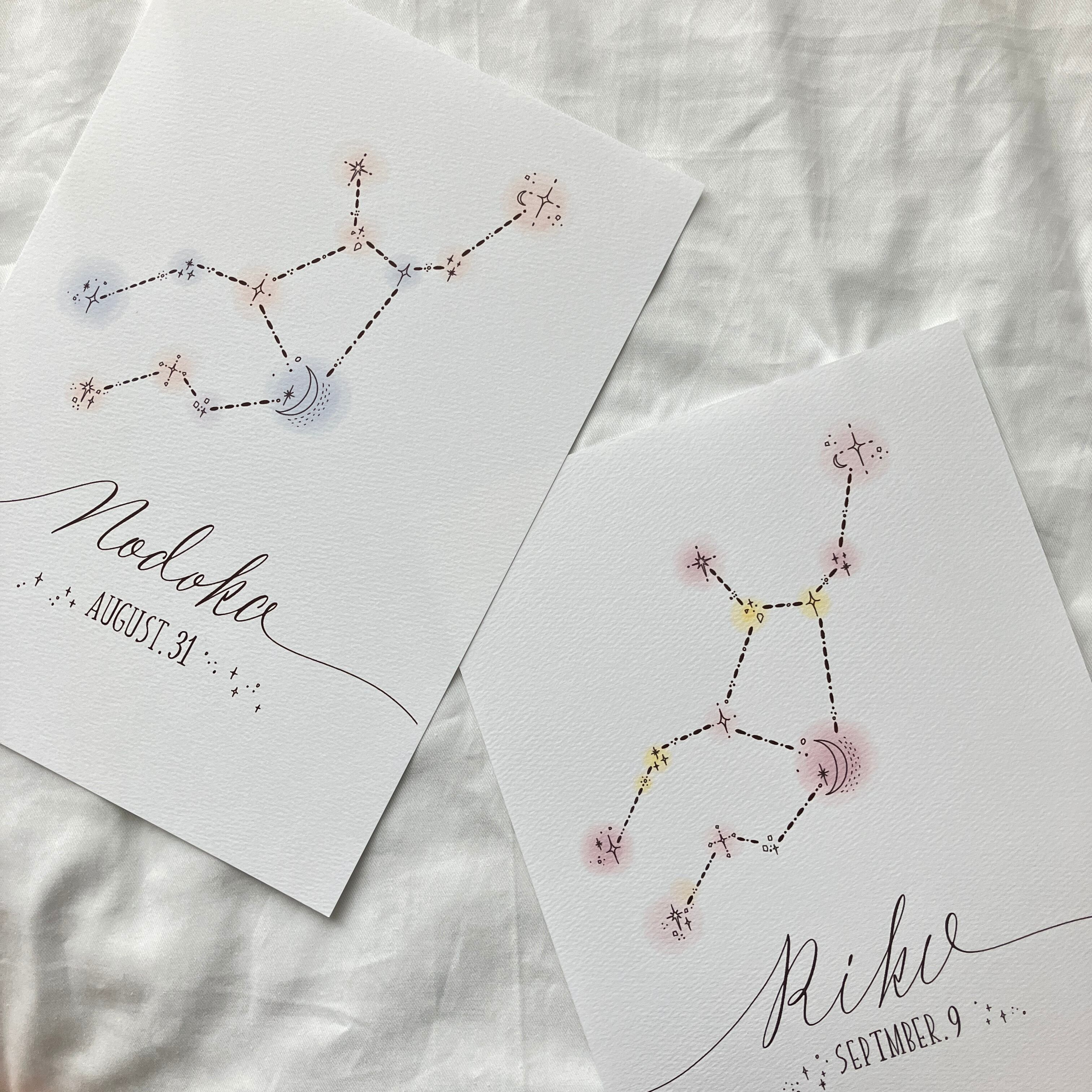 オリジナルの星座のイラストとカリグラフィ風のお名前を組み合わせた